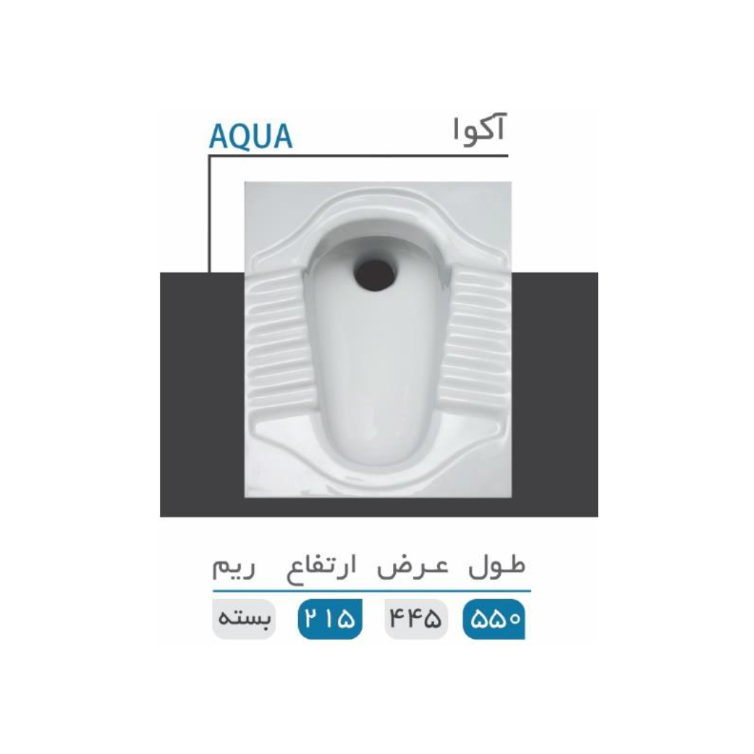 ابعاد این توالت زمینی ۲۱*۴۶*۵۶ سانتی متر و سایز آن ۵۵ است. توالت ها عمدتا در دو نوع آبریز باز و آبریز بسته هستند. این توالت ایرانی همان طور که گفته شد از نوع ریم بسته می باشد. در این توالت ها به وسیله کانال بسته اطراف کاسه و سوراخ هایی که در دو طرف قرار دارند ، آب در هنگام استفاده از فلاش تانک با شدت بیشتری وارد کاسه می گردد و عملیات شست و شو و آب گیری به نحو کامل تری صورت می پذیرد. این توالت ایرانی در سه درجه برای مشتریان تولید و عرضه می گردد.