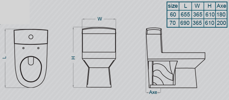 ابعاد این توالت فرنگی ۶۱*۳۶٫۵*۶۵٫۵ سانتی متر و سایز آن ۶۰ است. این توالت دارای سیستم فلاش دو زمانه و سیستم تخلیه واترجت می باشد. خروجی سیفون این توالت فرنگی به کف است. از ویژگی های این توالت می توان به درب نشیمن آرام بند اشاره نمود. سرعت تخلیه آن ۵ ثانیه و حجم آب مصرفی در هر تخلیه ۸ لیتر می باشد. این توالت فرنگی در سه درجه برای مشتریان تولید و عرضه می گردد.