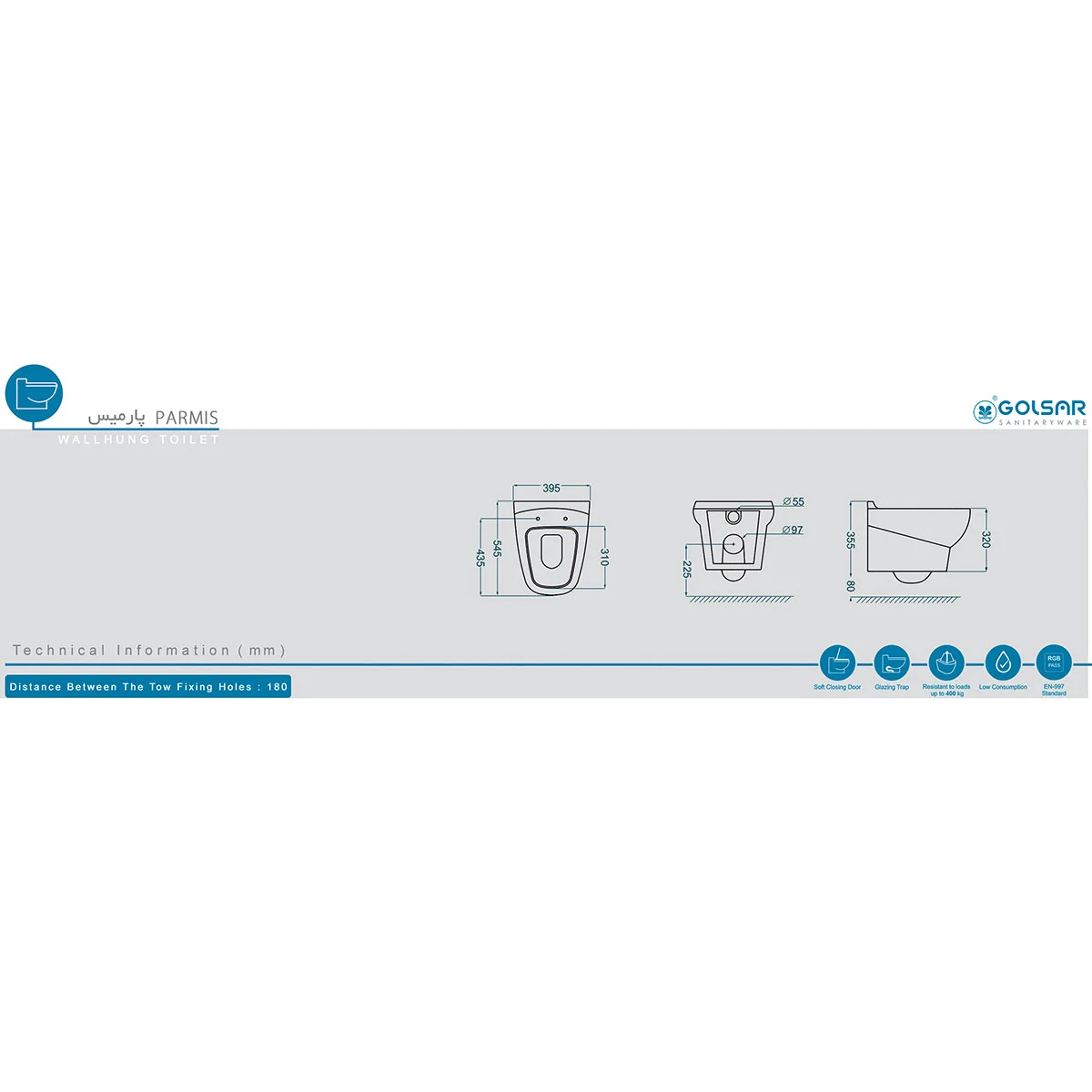 مکانیزم بسته شدن درب وال هنگ گلسار مدل پارمیس از نوع آرامبند است. این نوع درها به صورت هیدرولیک بوده و دارای فنرهای مخصوصی هستند که از بسته شدن ناگهانی در توالت فرنگی جلوگیری میکند. آکس این توالت وال هنگ 18 سانتیمتر است. این بدان معنی است که فاصله دو جای پیچ پشت وال هنگ که به فلاش تانک توکار متصل می شود 18 سانتی متر است.