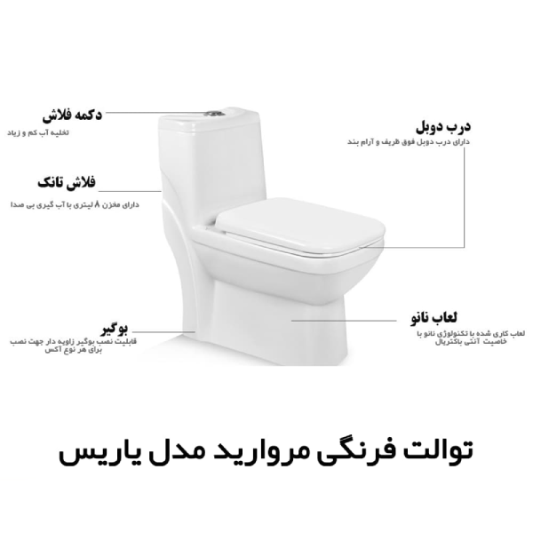 توالت فرنگی مروارید مدل یاریس دارای سیستم تخلیه آبشاری است. خروجی این توالت به کف می باشد. سایز این محصول ۶۷ است. ابعاد آن ، ۶۶*۳۴٫۴*۶۵٫۲ سانتی متر و وزن آن ، ۳۹ کیلوگرم می باشد. آکس این محصول ۲۱٫۳ سانتی متر است. این توالت فرنگی مروارید در سه درجه تولید می گردد. یکی از مزیت های این محصول پر فروش طراحی زیبا و کلاسیک آن است که جلوه ای زیبا به سرویس بهداشتی شما میدهد.