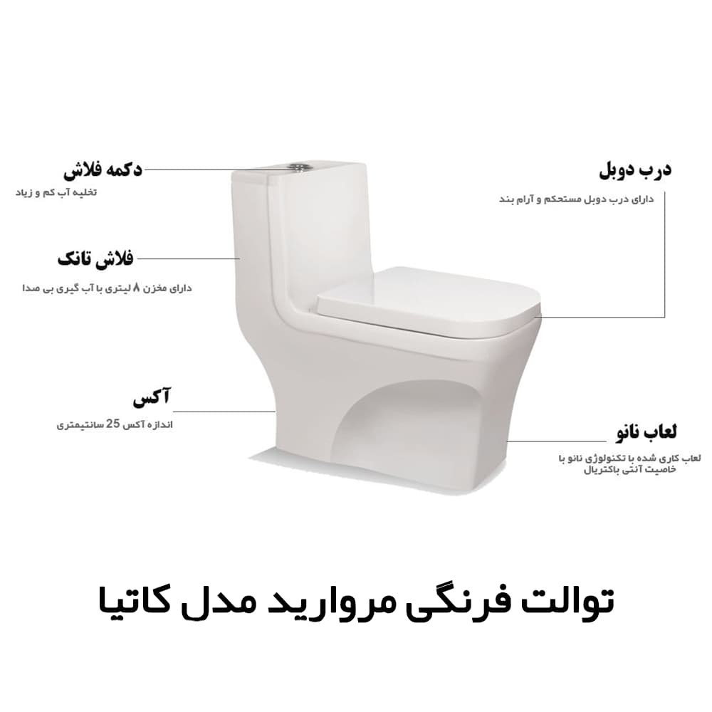 توالت فرنگی مروارید مدل کاتیا یک تکه است. این توالت فرنگی مروارید در سه درجه تولید می گردد. مزیت این محصول قیمت مقرون بصرفه آن میباشد. همچنین طراحی مستطیل شکل این محصول مد می باشد. این توالت فرنگی دارای سیستم سوپر جت است. توالت های فرنگی مروارید دارای یک سال ضمانت این شرکت می باشند. خروجی این توالت به کف می باشد. سایز این توالت فرنگی ۷۲ است. ابعاد آن ، ۷۰٫۲*۳۷٫۷*۷۱ سانتی متر و وزن آن ، ۴۷٫۶ کیلوگرم می باشد.