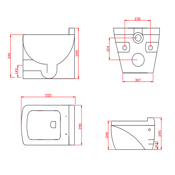 ابعاد این محصول 39.5*39*55.5 سانتیمتر است. این توالت فرنگی از سیستم فلاش یک زمانه استفاده میکند. در سیستم فلاش یک زمانه تخلیه فقط با یک حجم صورت میگیرد. به طوری که برای تمام مواقع از حجم آب یکسانی برای تخلیه توالت فرنگی استفاده میشود.