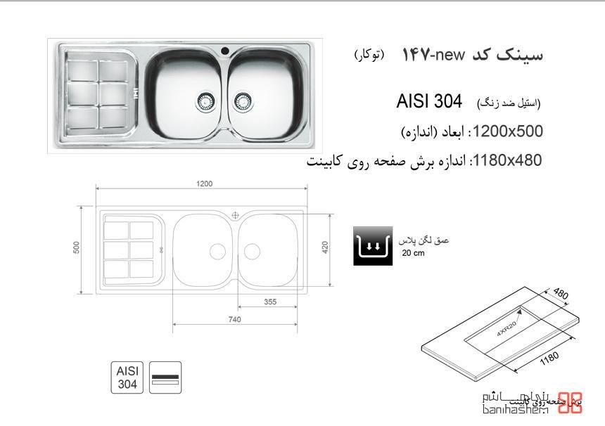سینک اخوان مدل 147 از انواع سینک توکار محسوب میشود. نمای سینک استیل شده است. ابعاد سینک 50*120 سانتیمتر است. این سینک از انواع عمیق به شمار میرود. سینک توکار اخوان مدل 147 دارای دو لگن و یک سینی است که برای قرار دادن وسایل مناسب خواهد بود. از لوازم جانبی این سینک میتوان به سیفون و زیرآب اشاره کرد. سیفون ظرفشویی در بسیاری از سینکها جزو لوازم جانبی به حساب میآید. این وسیله در زیر سینک ظرفشویی نصب شده و کاربرد آن خارج کردن آب به سمت فاضلاب میباشد.
