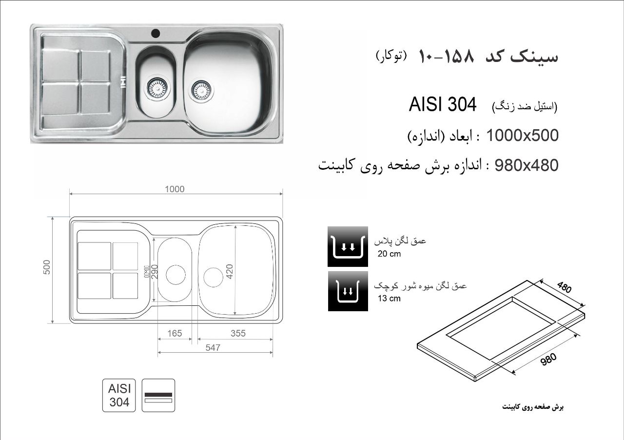 سینک اخوان مدل 158 از انواع سینک توکار محسوب میشود. نمای سینک استیل شده است. ابعاد سینک 50*100 سانتیمتر است. این سینک از انواع عمیق به شمار میرود. سینک توکار اخوان مدل 158 دارای یک لگن و یک سینی است که برای قرار دادن وسایل مناسب خواهد بود. از لوازم جانبی این سینک میتوان به سیفون و زیرآب اشاره کرد. سیفون ظرفشویی در بسیاری از سینکها جزو لوازم جانبی به حساب میآید. این وسیله در زیر سینک ظرفشویی نصب شده و کاربرد آن خارج کردن آب به سمت فاضلاب میباشد. همچنین این سینک دارای یک میوه شور است.