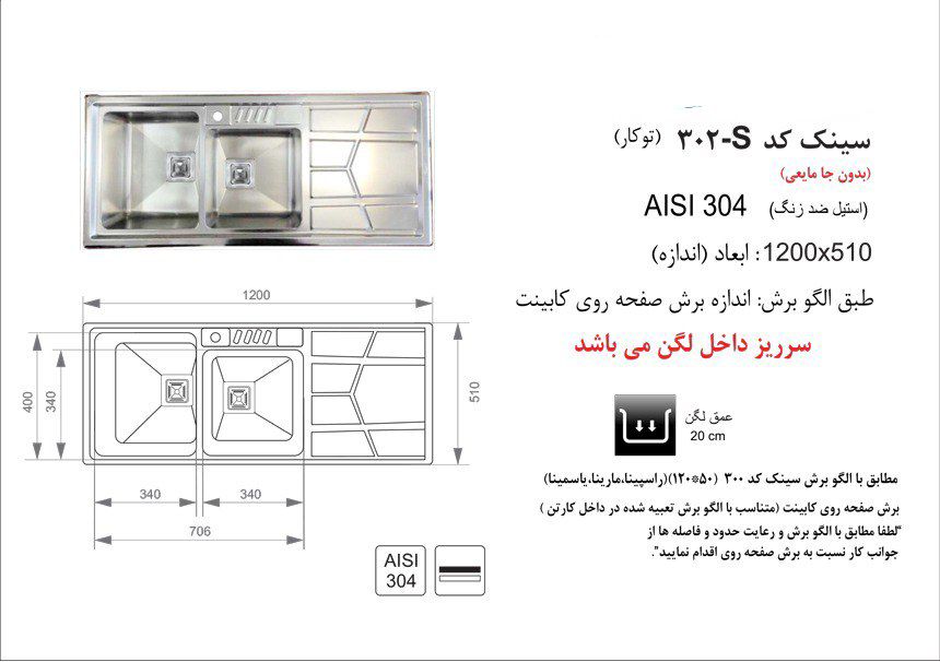 سینک اخوان مدل 302S از انواع سینک توکار محسوب میشود و در دسته سینکهای باکسی قرار میگیرد. نمای سینک استیل شده است. ابعاد سینک 50*120 سانتیمتر است. این سینک از انواع عمیق به شمار میرود. سینک توکار اخوان مدل 302S دارای دو لگن و یک سینی است که برای قرار دادن وسایل مناسب خواهد بود. از لوازم جانبی این سینک میتوان به سیفون و زیرآب اشاره کرد. سیفون ظرفشویی در بسیاری از سینکها جزو لوازم جانبی به حساب میآید. این وسیله در زیر سینک ظرفشویی نصب شده و کاربرد آن خارج کردن آب به سمت فاضلاب میباشد.