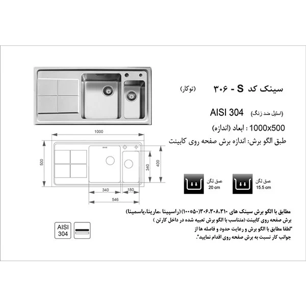 سینک اخوان مدل 306S از انواع سینک توکار محسوب میشود و در دسته سینکهای باکسی قرار میگیرد. نمای سینک استیل شده است. ابعاد سینک 50*100 سانتیمتر است. این سینک از انواع عمیق به شمار میرود. سینک توکار اخوان مدل 306S دارای یک لگن و یک سینی است که برای قرار دادن وسایل مناسب خواهد بود. از لوازم جانبی این سینک میتوان به سیفون و زیرآب اشاره کرد. سیفون ظرفشویی در بسیاری از سینکها جزو لوازم جانبی به حساب میآید. این وسیله در زیر سینک ظرفشویی نصب شده و کاربرد آن خارج کردن آب به سمت فاضلاب میباشد. همچنین این سینک دارای یک میوه شور است.