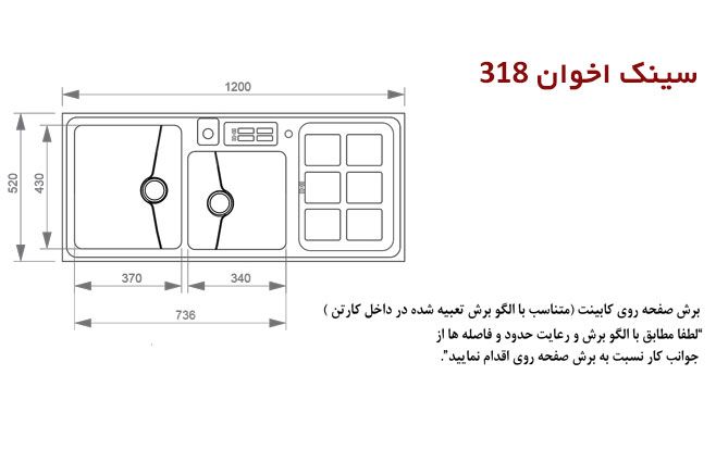 سینک اخوان مدل 318 از انواع سینک توکار محسوب میشود و در دسته سینکهای باکسی قرار میگیرد. نمای سینک استیل شده است. ابعاد سینک 52*120 سانتیمتر است. این سینک از انواع عمیق به شمار میرود. سینک توکار اخوان مدل 318 دارای دو لگن و یک سینی است که برای قرار دادن وسایل مناسب خواهد بود. از لوازم جانبی این سینک میتوان به سیفون و زیرآب اشاره کرد. سیفون ظرفشویی در بسیاری از سینکها جزو لوازم جانبی به حساب میآید. این وسیله در زیر سینک ظرفشویی نصب شده و کاربرد آن خارج کردن آب به سمت فاضلاب میباشد.
