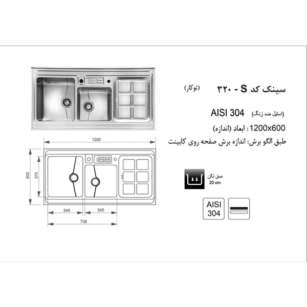 سینک اخوان مدل 320S از انواع سینک روکار محسوب میشود و در دسته سینکهای باکسی قرار میگیرد. نمای سینک استیل شده است. ابعاد سینک 60*120 سانتیمتر است. این سینک از انواع عمیق به شمار میرود. سینک روکار اخوان مدل 320S دارای دو لگن و یک سینی است که برای قرار دادن وسایل مناسب خواهد بود.
