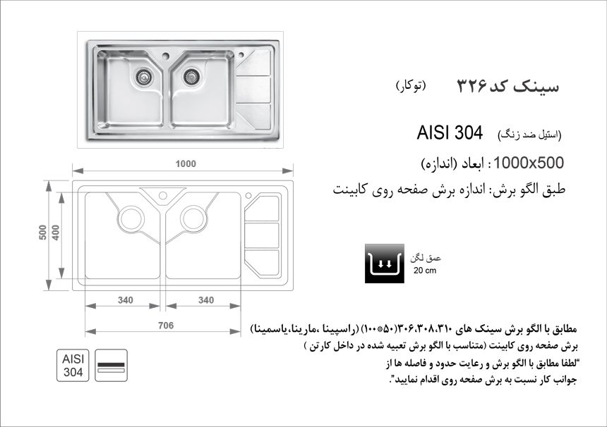 سینک اخوان مدل 326 از انواع سینک توکار محسوب میشود و در دسته سینکهای باکسی قرار میگیرد. نمای سینک استیل شده است. ابعاد سینک 50*100 سانتیمتر است. این سینک از انواع عمیق به شمار میرود. سینک توکار اخوان مدل 326 دارای دو لگن و یک سینی است که برای قرار دادن وسایل مناسب خواهد بود. از لوازم جانبی این سینک میتوان به سیفون و زیرآب اشاره کرد. سیفون ظرفشویی در بسیاری از سینکها جزو لوازم جانبی به حساب میآید. این وسیله در زیر سینک ظرفشویی نصب شده و کاربرد آن خارج کردن آب به سمت فاضلاب میباشد.