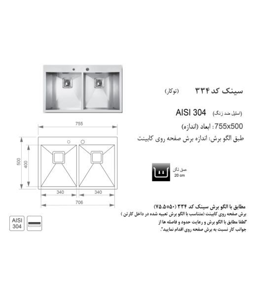 سینک اخوان مدل 334 از انواع سینک توکار محسوب میشود و در دسته سینکهای باکسی قرار میگیرد. نمای سینک استیل شده است. ابعاد سینک 50*75.5 سانتیمتر است. این سینک از انواع عمیق به شمار میرود. سینک توکار اخوان مدل 334 دارای دو لگن است. از لوازم جانبی این سینک میتوان به سیفون و زیرآب اشاره کرد. سیفون ظرفشویی در بسیاری از سینکها جزو لوازم جانبی به حساب میآید. این وسیله در زیر سینک ظرفشویی نصب شده و کاربرد آن خارج کردن آب به سمت فاضلاب میباشد.