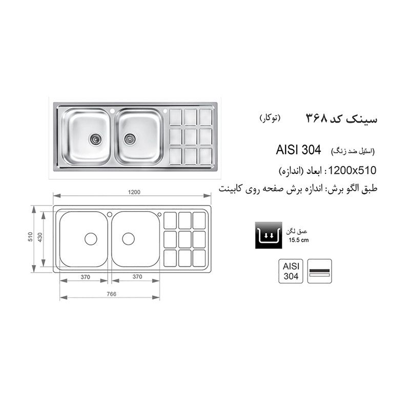 سینک اخوان مدل 368 از انواع سینک توکار محسوب میشود و در دسته سینکهای باکسی قرار میگیرد. نمای سینک استیل شده است. ابعاد سینک 51*120 سانتیمتر است. این سینک از انواع نیمه عمیق به شمار میرود. سینک توکار اخوان مدل 368 دارای دو لگن و یک سینی است که برای قرار دادن وسایل مناسب خواهد بود. از لوازم جانبی این سینک میتوان به سیفون و زیرآب اشاره کرد. سیفون ظرفشویی در بسیاری از سینکها جزو لوازم جانبی به حساب میآید. این وسیله در زیر سینک ظرفشویی نصب شده و کاربرد آن خارج کردن آب به سمت فاضلاب میباشد.نوع اتصال سینک اخوان مدل 368 بست فلزی است.