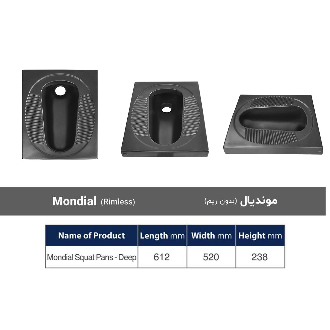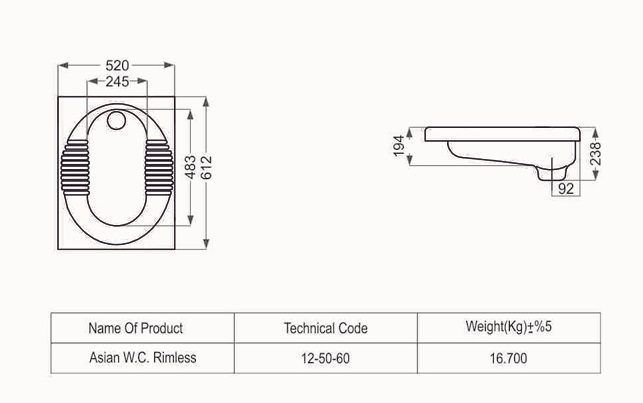 این توالت ایرانی از نوع آبریز لس (ریم لس) است. توالت های ایرانی آبریز لس ، مشابه سیستم تخلیه توربوجت در توالت های فرنگی می باشند و آب با فشار از سه ناحیه در کاسه که تعبیه گردیده به بیرون جریان می یابد. ابعاد آن ، ۲۳٫۸*۵۲*۶۱٫۲ سانتی متر و وزن آن ، ۱۶٫۷ کیلوگرم می باشد. هم چنین این توالت مروارید در سه درجه برای مشتریان تولید می گردد.