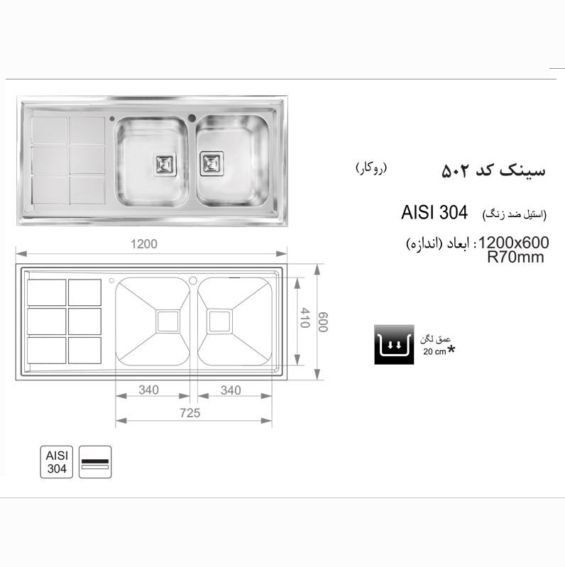 سینک اخوان مدل 502 از انواع سینک روکار محسوب میشود و در دسته سینکهای باکسی قرار میگیرد. نمای سینک استیل شده است. ابعاد سینک 60*120 سانتیمتر است. این سینک از انواع عمیق به شمار میرود. سینک روکار اخوان مدل 502 دارای دو لگن و یک سینی است که برای قرار دادن وسایل مناسب خواهد بود. از لوازم جانبی این سینک میتوان به سیفون و زیرآب اشاره کرد. سیفون ظرفشویی در بسیاری از سینکها جزو لوازم جانبی به حساب میآید. این وسیله در زیر سینک ظرفشویی نصب شده و کاربرد آن خارج کردن آب به سمت فاضلاب میباشد.