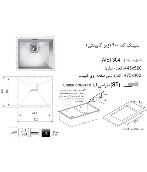 سینک اخوان مدل 400 از انواع سینک زیرکورین (زیرصفحهای) محسوب میشود. نمای سینک استیل شده است. ابعاد سینک 40*47.5 سانتیمتر است. این سینک از انواع عمیق به شمار میرود. سینک زیرکورین اخوان مدل 400 دارای یک لگن است. از لوازم جانبی این سینک میتوان به سیفون و زیرآب اشاره کرد. سیفون ظرفشویی در بسیاری از سینکها جزو لوازم جانبی به حساب میآید. این وسیله در زیر سینک ظرفشویی نصب شده و کاربرد آن خارج کردن آب به سمت فاضلاب میباشد.