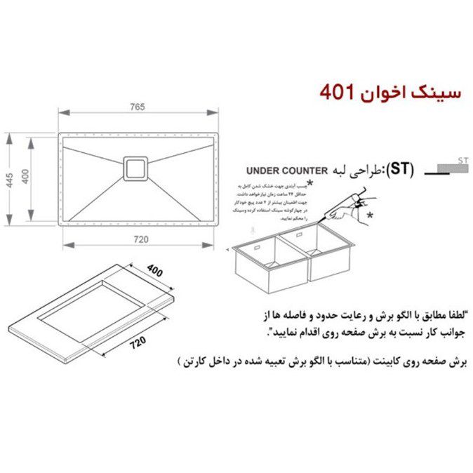 سینک اخوان مدل 401 از انواع سینک زیرکورین (زیرصفحهای) محسوب میشود. نمای سینک استیل شده است. ابعاد سینک 40*72 سانتیمتر است. این سینک از انواع عمیق به شمار میرود. سینک زیرکورین اخوان مدل 401 دارای یک لگن است. از لوازم جانبی این سینک میتوان به سیفون و زیرآب اشاره کرد. سیفون ظرفشویی در بسیاری از سینکها جزو لوازم جانبی به حساب میآید. این وسیله در زیر سینک ظرفشویی نصب شده و کاربرد آن خارج کردن آب به سمت فاضلاب میباشد.