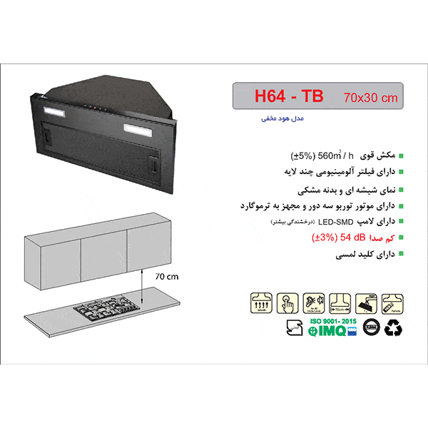 هود مخفی اخوان مدل H206 از انواع هود مخفی به شمار میرود. نمای ظاهری هود شیشه و بدنه مشکی کار شده است. اندازه آن 30*70 سانتیمتر است. این هود دارای ریموت کنترل، فیلتر آلومینیومی چند لایه و لامپ SMD است. قدرت مکش هود 560 مترمکعب و میزان صدای آن 54 دسیبل است. هود مخفی اخوان مدل H206 دارای صفحه کلید لمسی است. از دیگر ویژگیهای این هود میتوان به موتور توربو اشاره کرد.