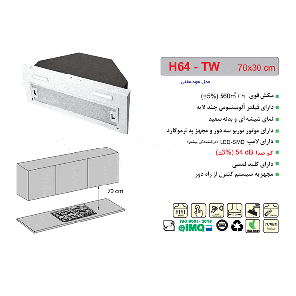 هود مخفی اخوان مدل H214 از انواع هود مخفی به شمار میرود. نمای ظاهری هود شیشه سفید کار شده است. اندازه آن 30*70 سانتیمتر است. این هود دارای ریموت کنترل، فیلتر آلومینیومی چند لایه و لامپ SMD است. قدرت مکش هود 560 مترمکعب و میزان صدای آن 54 دسیبل است. هود مخفی اخوان مدل H214 دارای صفحه نمایش LCD و صفحه کلید لمسی است. از دیگر ویژگیهای این هود میتوان به موتور توربو اشاره کرد.