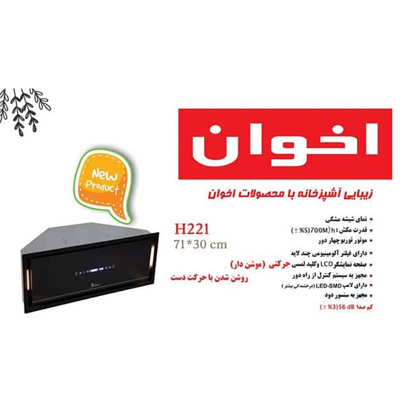 هود مخفی اخوان مدل H221 از انواع هود مخفی به شمار میرود. نمای ظاهری هود شیشه مشکی کار شده است. اندازه آن ۳۰*۷1 سانتیمتر است. این هود دارای ریموت کنترل، فیلتر آلومینیومی چند لایه و لامپ LED/SMD است. قدرت مکش هود ۷۰۰ مترمکعب و میزان صدای آن ۵۶ دسیبل است. هود مخفی اخوان مدل H221 دارای صفحه نمایش LCD و صفحه کلید لمسی و کلید لمسی حرکتی (موشن دار) است. از دیگر ویژگیهای این هود میتوان به موتور توربو ۴ دور و سنسور دود اشاره کرد.